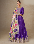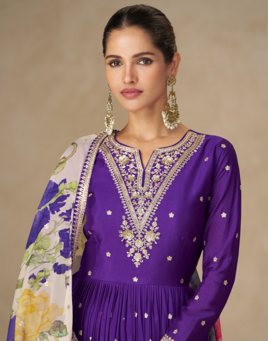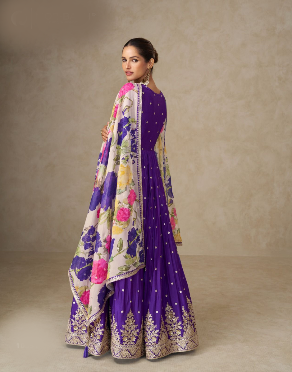 Women’s Embroidered Purple Chinnon Anarkali Outfit with Vibrant Floral Dupatta - Buy